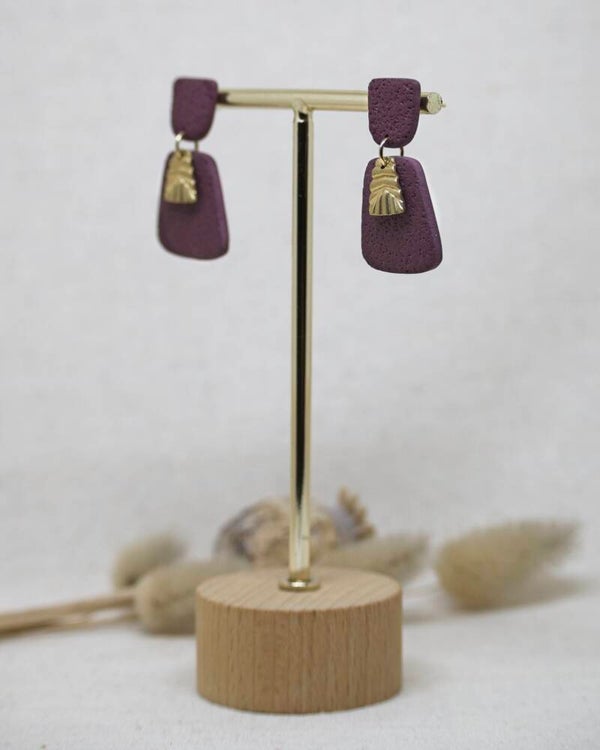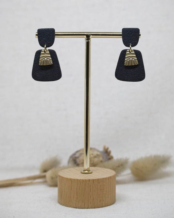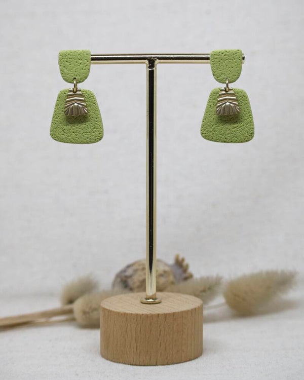 Het kleine gouden trapezium hangertje is niet verkrijgbaar in zilver. Als je zilver kiest, krijg je de kleioorbel met zilveren tussenringen (dus zonder hanger).