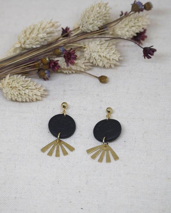 Deze oorbellen hebben een botanische afdruk gecombineerd met een gouden waaier voor een extra stijlvolle look.